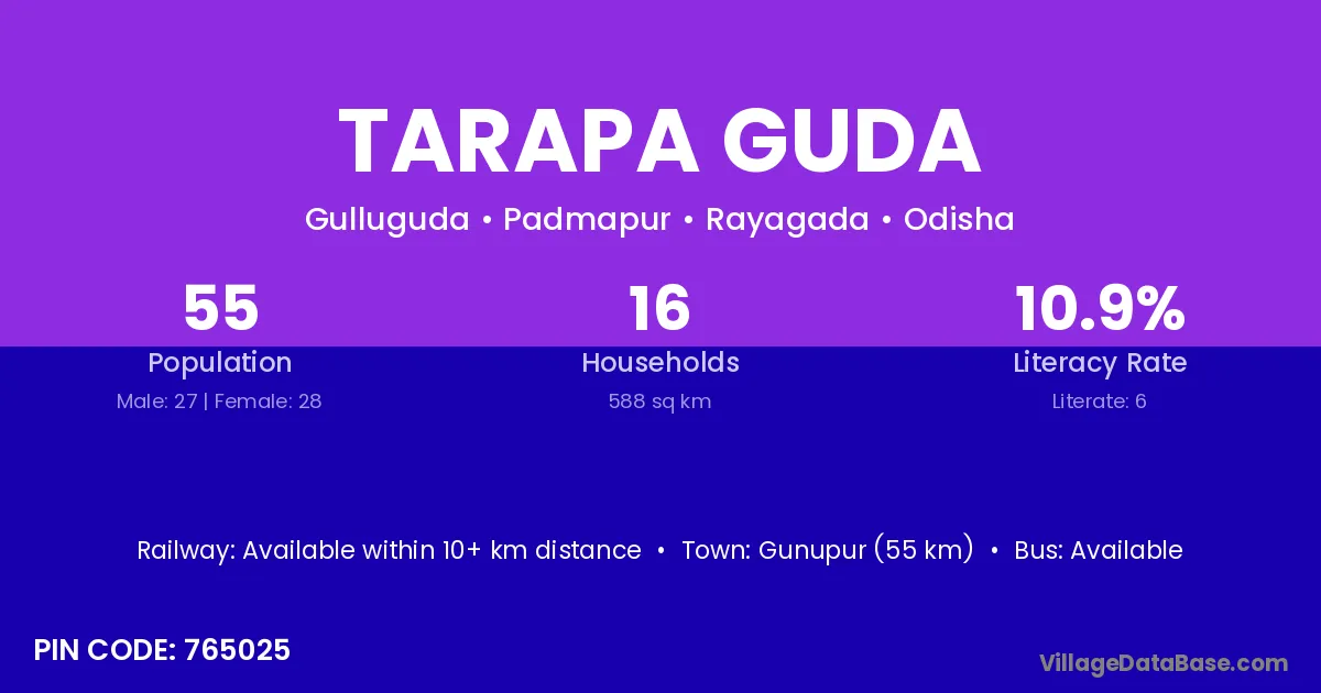 Gunupur (55 km) is the nearest town to Tarapa Guda village for major economic activities and is located approximately 55 km away.