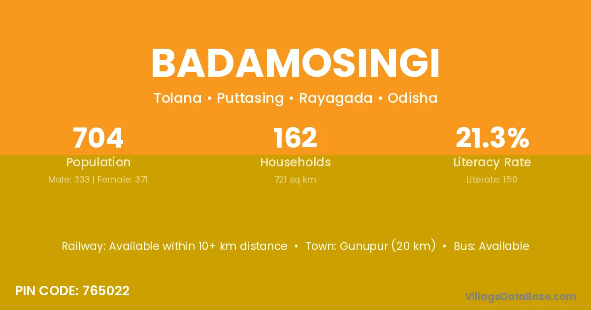 Gunupur (20 km) is the nearest town to Badamosingi village for major economic activities and is located approximately 20 km away.