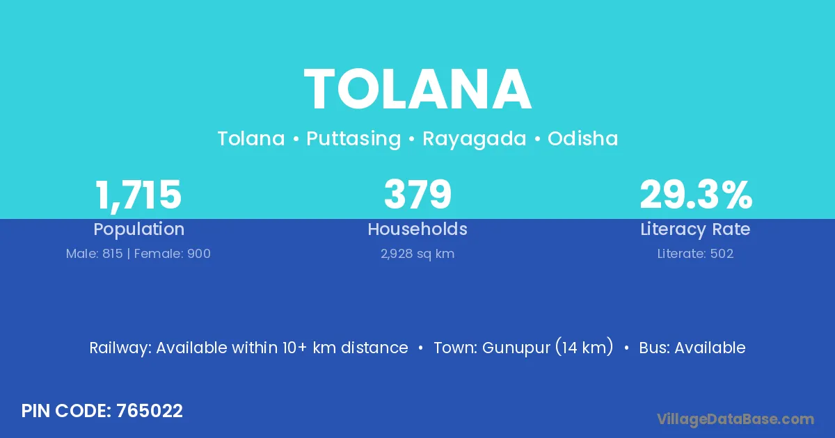 Gunupur (14 km) is the nearest town to Tolana village for major economic activities and is located approximately 14 km away.