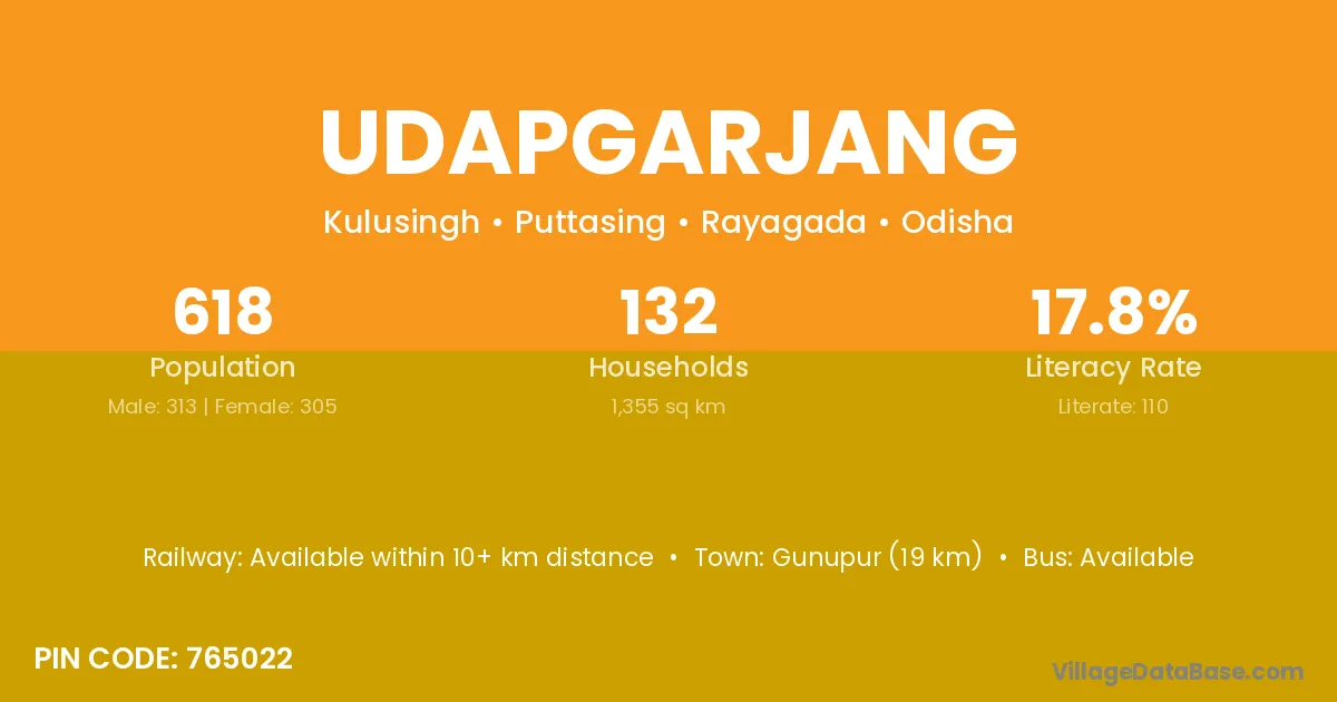 Gunupur (19 km) is the nearest town to Udapgarjang village for major economic activities and is located approximately 19 km away.