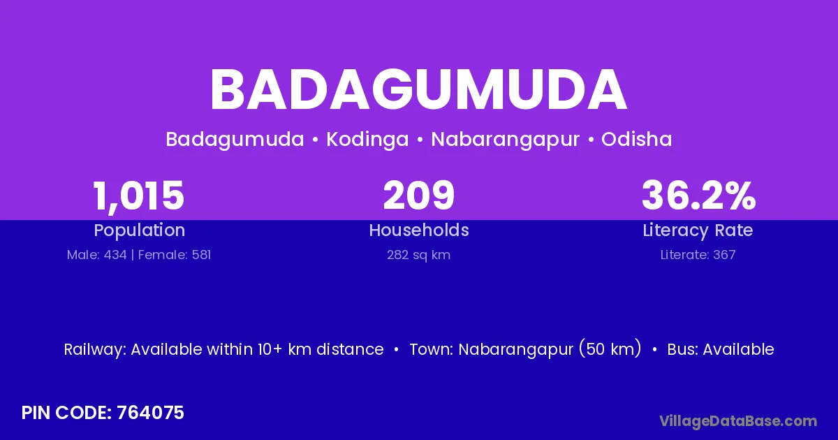 Rayagada (25 km) is the nearest town to Badagumuda village for major economic activities and is located approximately 25 km away.