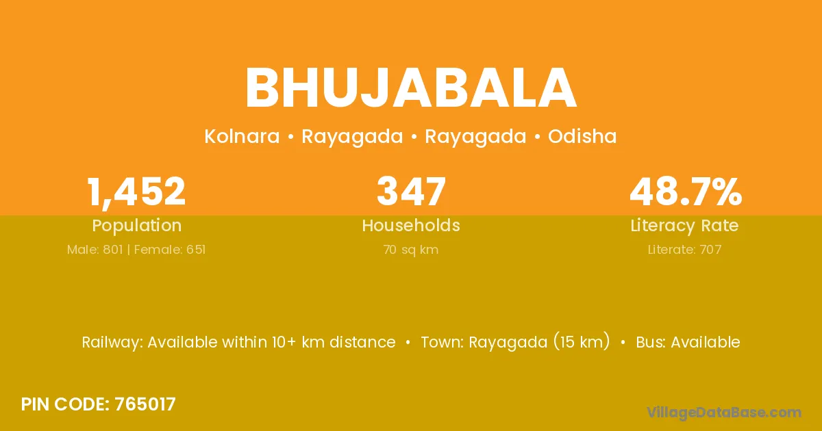 Rayagada (15 km) is the nearest town to Bhujabala village for major economic activities and is located approximately 15 km away.