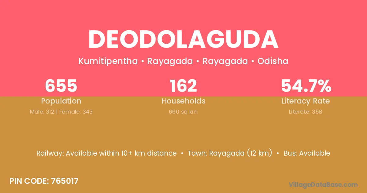 Rayagada (12 km) is the nearest town to Deodolaguda village for major economic activities and is located approximately 12 km away.