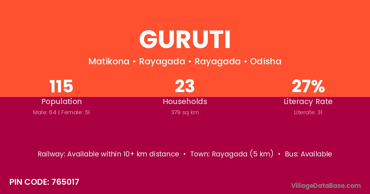 Rayagada (5 km) is the nearest town to Guruti village for major economic activities and is located approximately 5 km away.