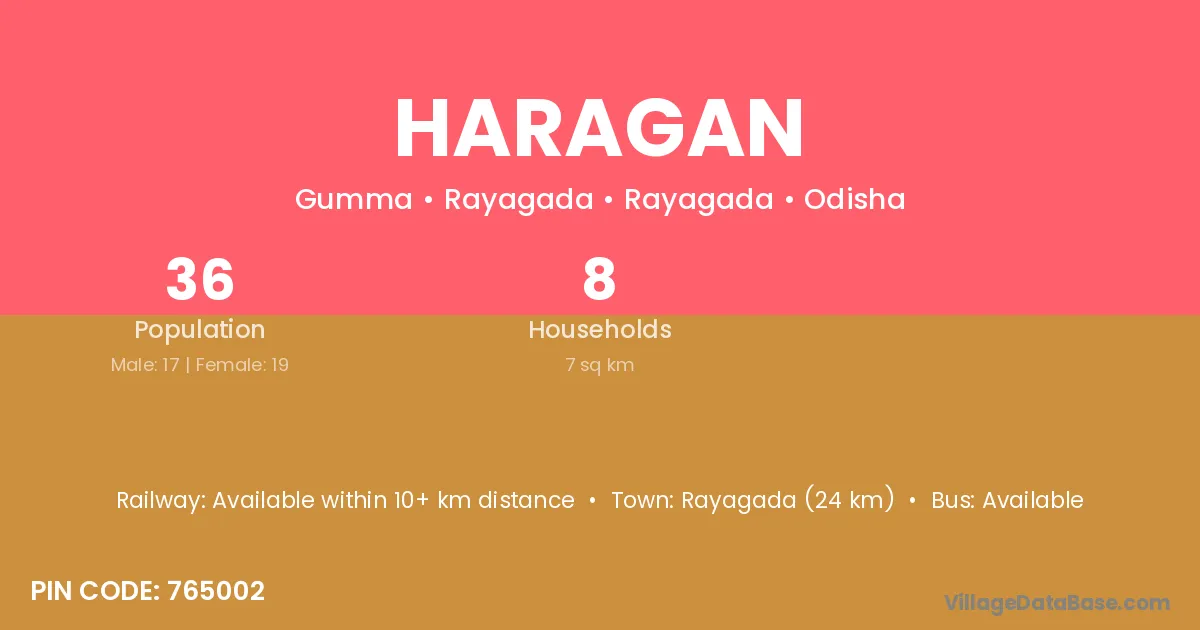 Rayagada (24 km) is the nearest town to Haragan village for major economic activities and is located approximately 24 km away.