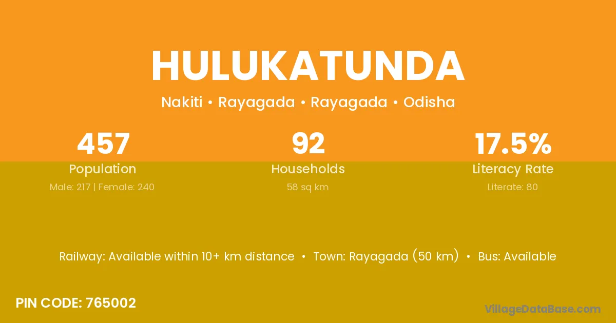 Rayagada (50 km) is the nearest town to Hulukatunda village for major economic activities and is located approximately 50 km away.