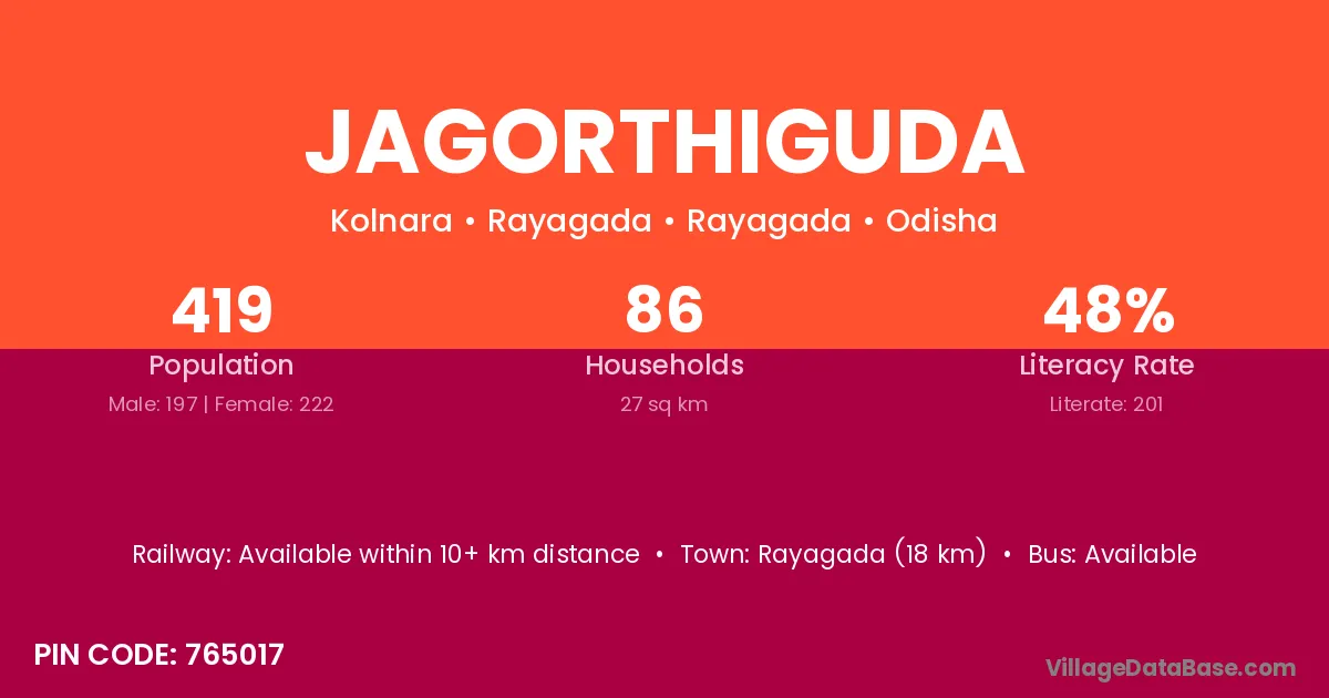 Rayagada (18 km) is the nearest town to Jagorthiguda village for major economic activities and is located approximately 18 km away.