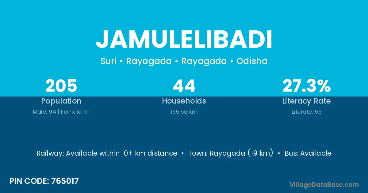 Rayagada (19 km) is the nearest town to Jamulelibadi village for major economic activities and is located approximately 19 km away.