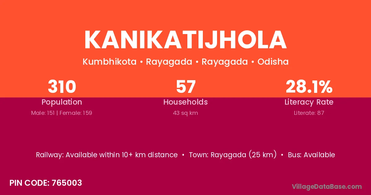 Rayagada (25 km) is the nearest town to Kanikatijhola village for major economic activities and is located approximately 25 km away.