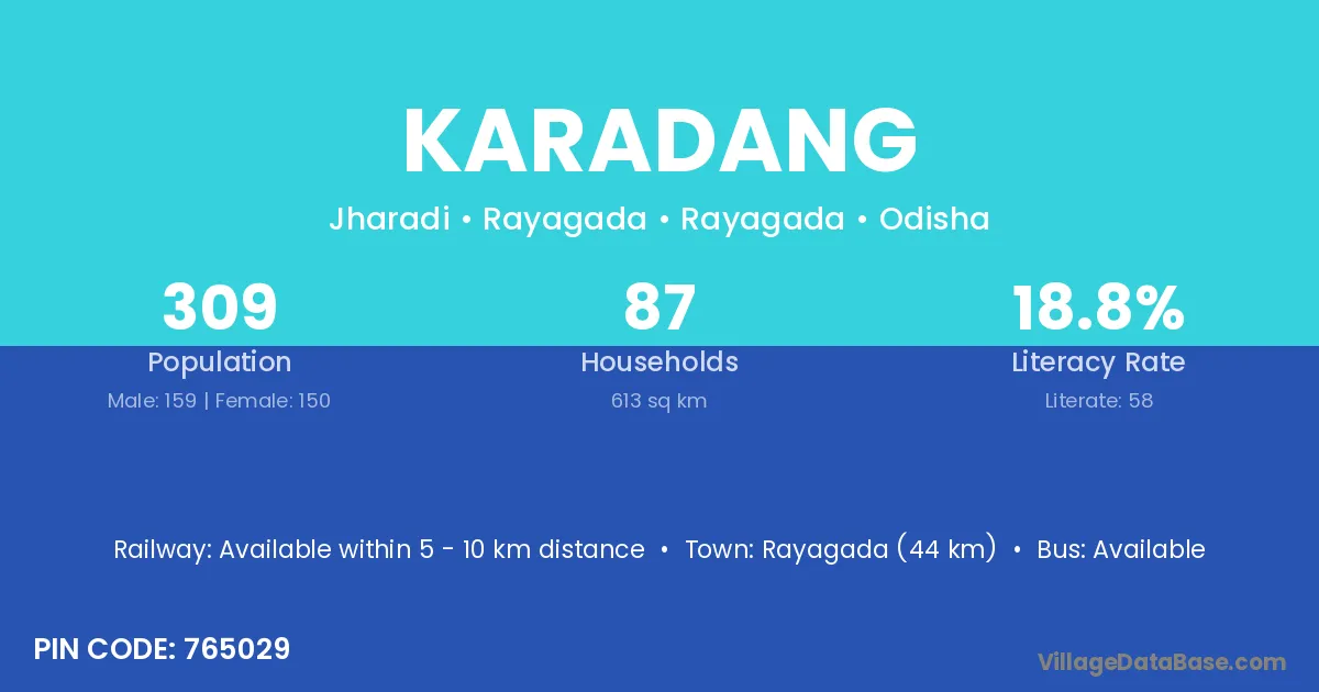 Rayagada (44 km) is the nearest town to Karadang village for major economic activities and is located approximately 44 km away.