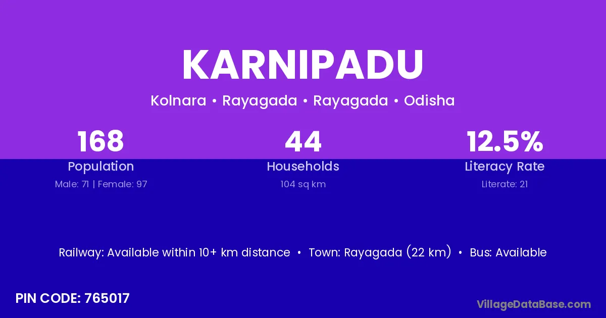 Rayagada (22 km) is the nearest town to Karnipadu village for major economic activities and is located approximately 22 km away.