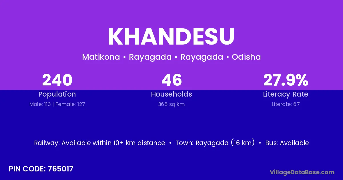 Rayagada (16 km) is the nearest town to Khandesu village for major economic activities and is located approximately 16 km away.