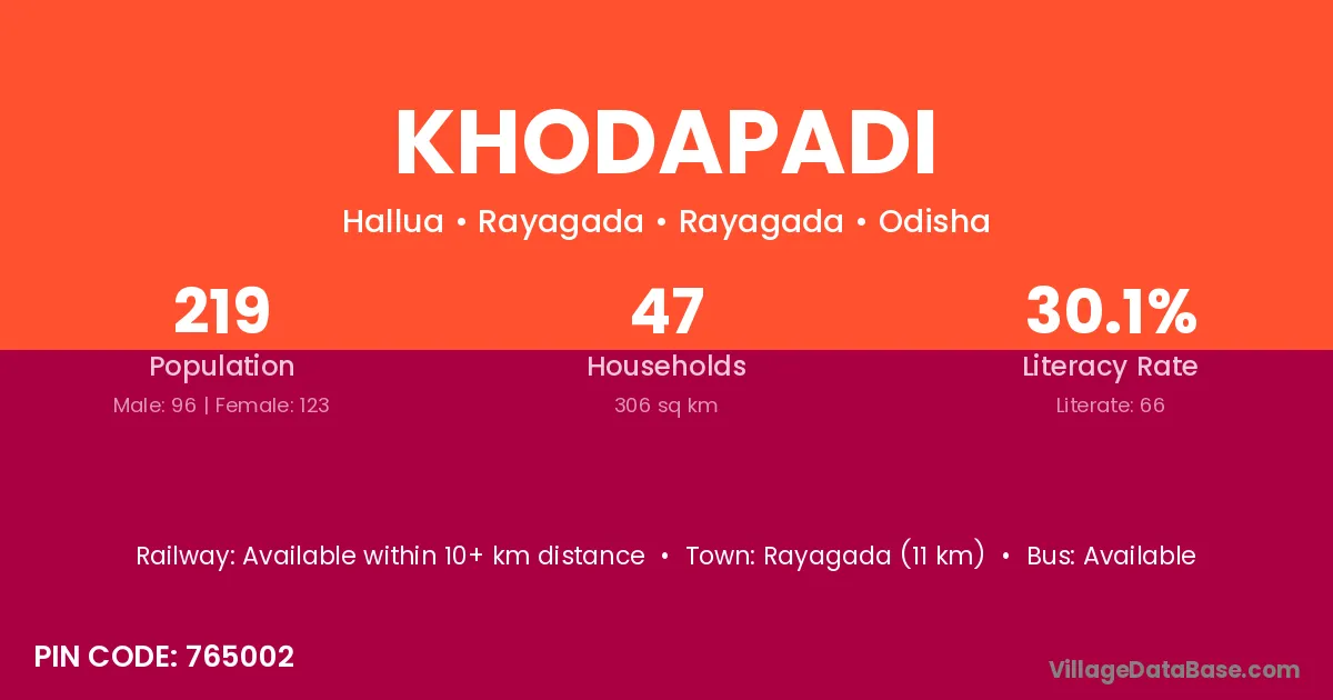 Rayagada (11 km) is the nearest town to Khodapadi village for major economic activities and is located approximately 11 km away.