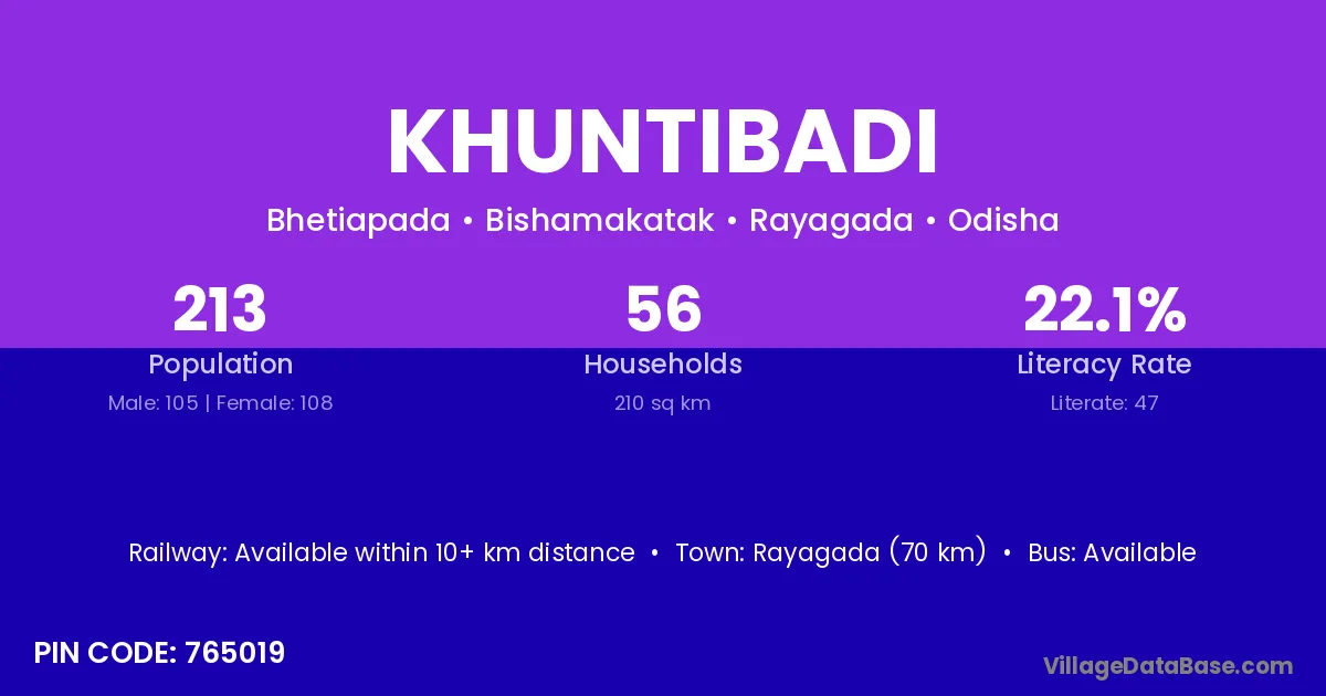 Rayagada (20 km) is the nearest town to Khuntibadi village for major economic activities and is located approximately 20 km away.