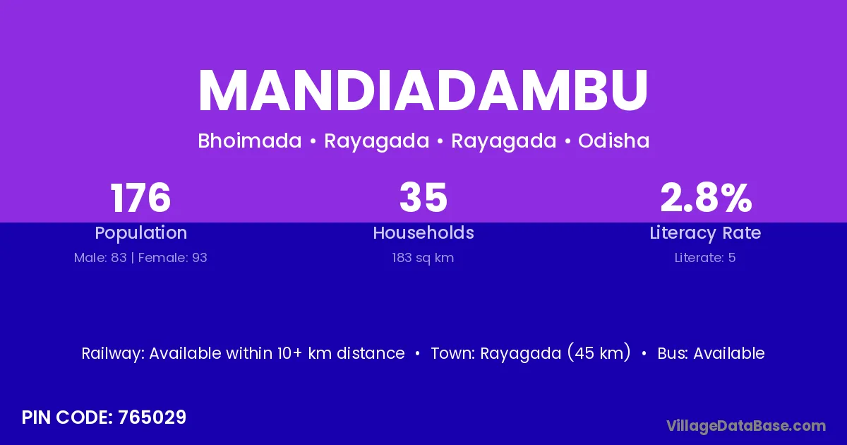 Rayagada (45 km) is the nearest town to Mandiadambu village for major economic activities and is located approximately 45 km away.