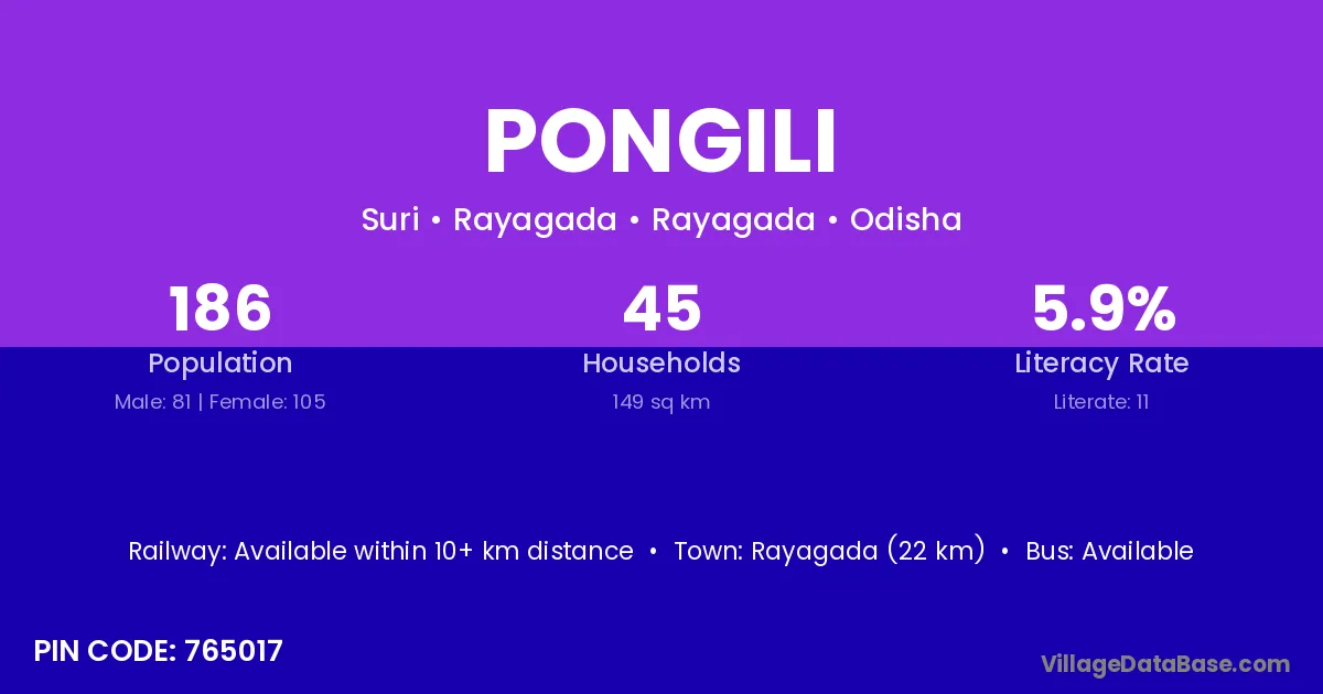 Rayagada (22 km) is the nearest town to Pongili village for major economic activities and is located approximately 22 km away.