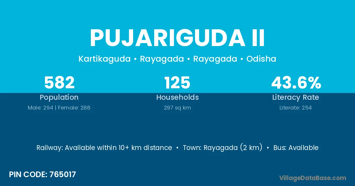 Rayagada (2 km) is the nearest town to Pujariguda Ii village for major economic activities and is located approximately 2 km away.