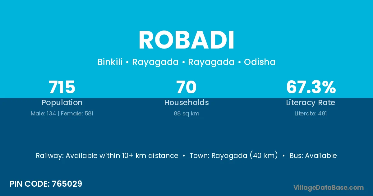 Rayagada (40 km) is the nearest town to Robadi village for major economic activities and is located approximately 40 km away.