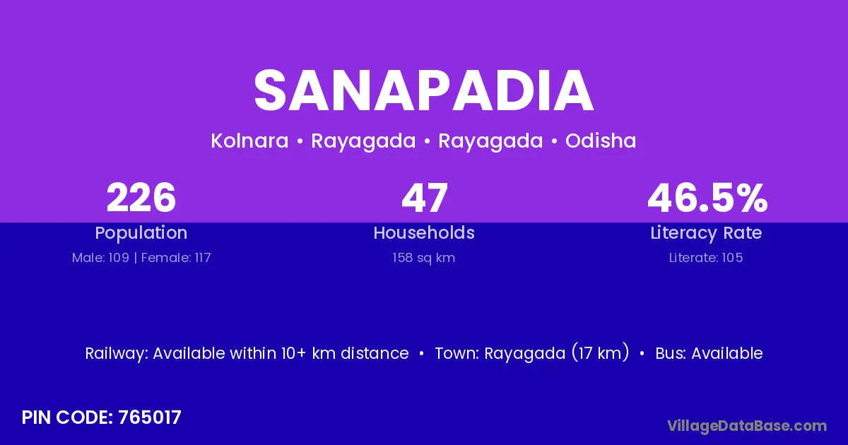 Rayagada (17 km) is the nearest town to Sanapadia village for major economic activities and is located approximately 17 km away.