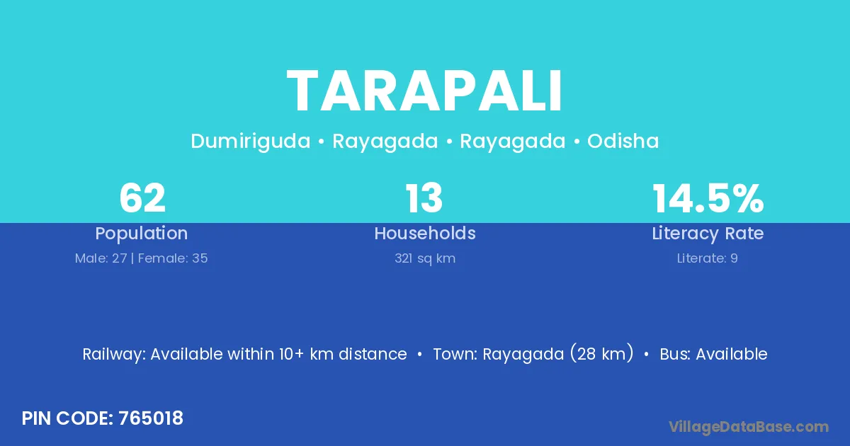 Rayagada (28 km) is the nearest town to Tarapali village for major economic activities and is located approximately 28 km away.