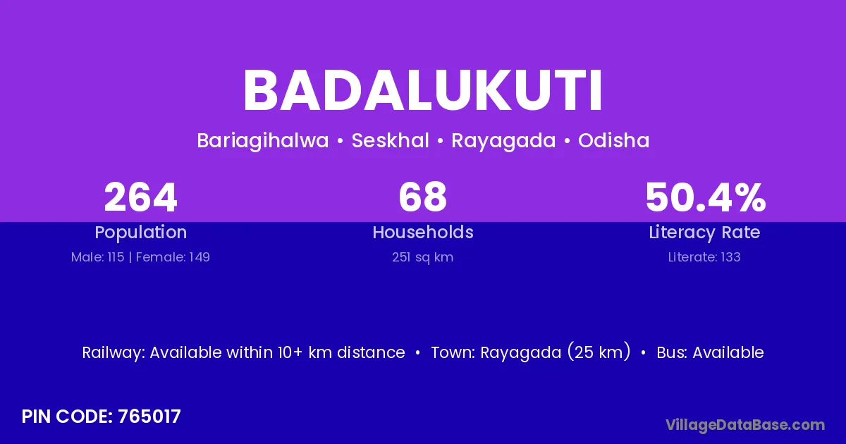 Rayagada (25 km) is the nearest town to Badalukuti village for major economic activities and is located approximately 25 km away.
