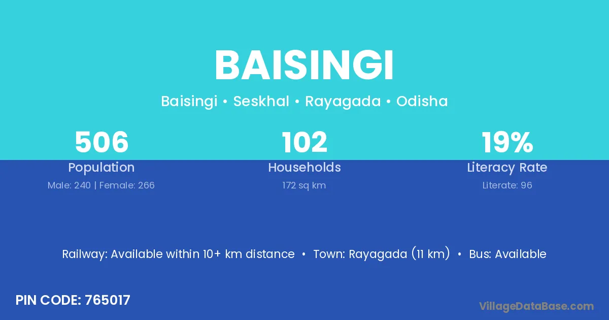 Rayagada (11 km) is the nearest town to Baisingi village for major economic activities and is located approximately 11 km away.