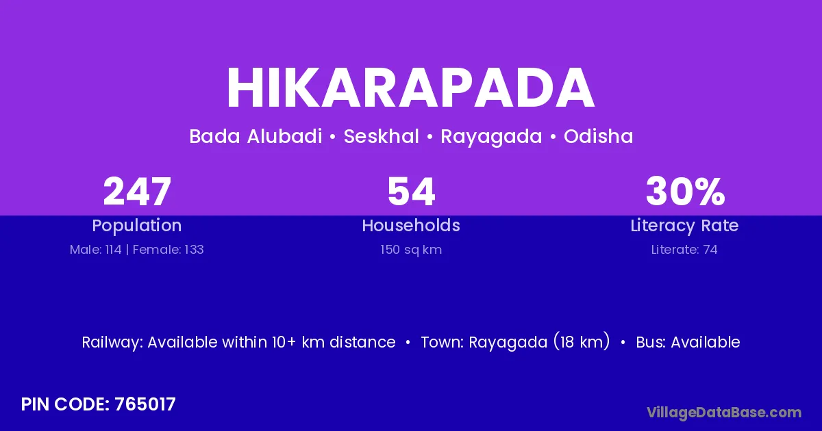 Rayagada (18 km) is the nearest town to Hikarapada village for major economic activities and is located approximately 18 km away.