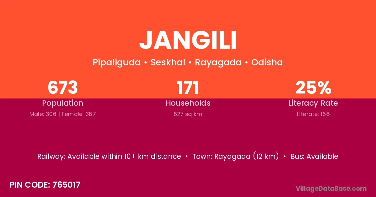 Rayagada (12 km) is the nearest town to Jangili village for major economic activities and is located approximately 12 km away.