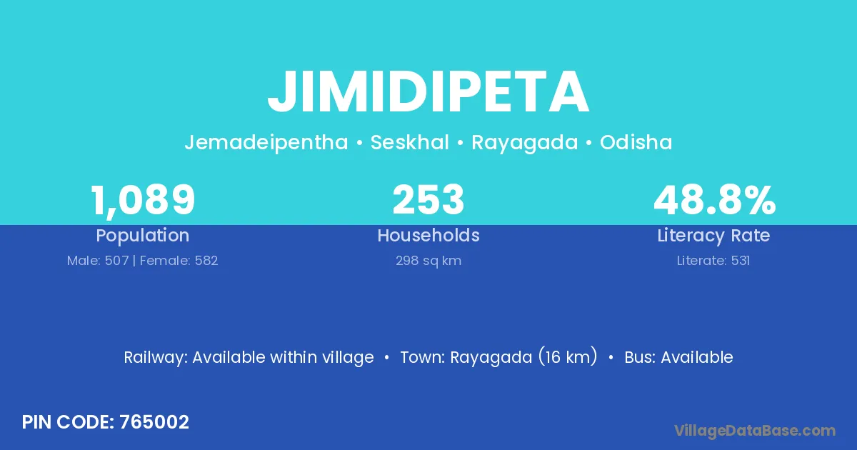 Rayagada (16 km) is the nearest town to Jimidipeta village for major economic activities and is located approximately 16 km away.