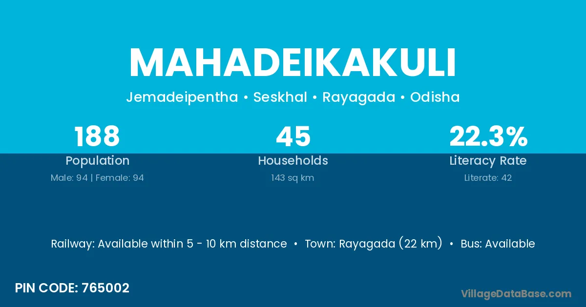 Rayagada (22 km) is the nearest town to Mahadeikakuli village for major economic activities and is located approximately 22 km away.