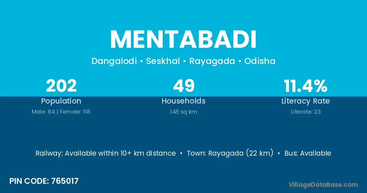Rayagada (22 km) is the nearest town to Mentabadi village for major economic activities and is located approximately 22 km away.