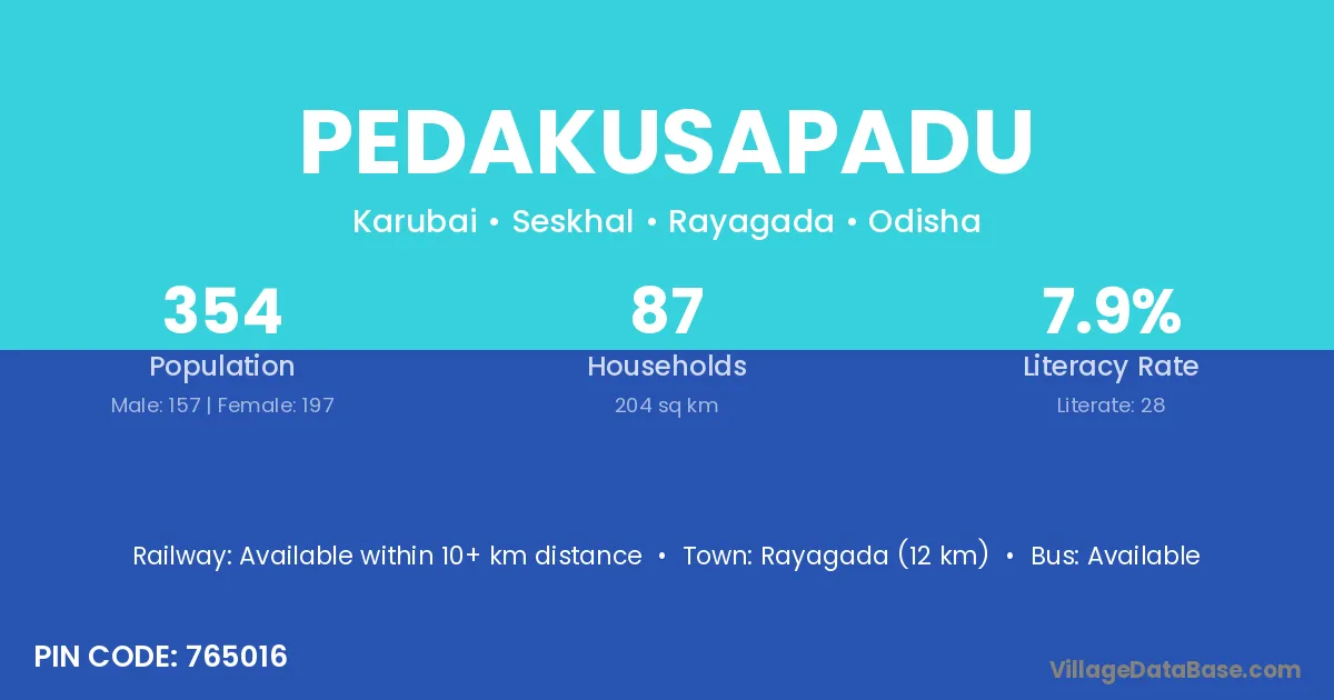Rayagada (12 km) is the nearest town to Pedakusapadu village for major economic activities and is located approximately 12 km away.