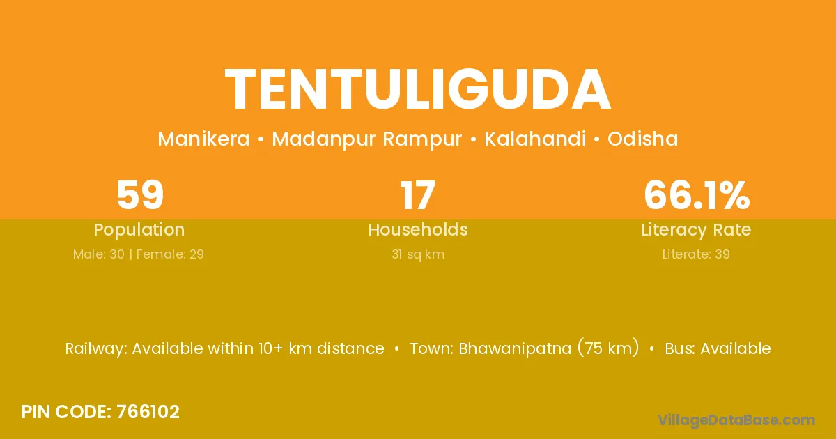 Rayagada (6 km) is the nearest town to Tentuliguda village for major economic activities and is located approximately 6 km away.