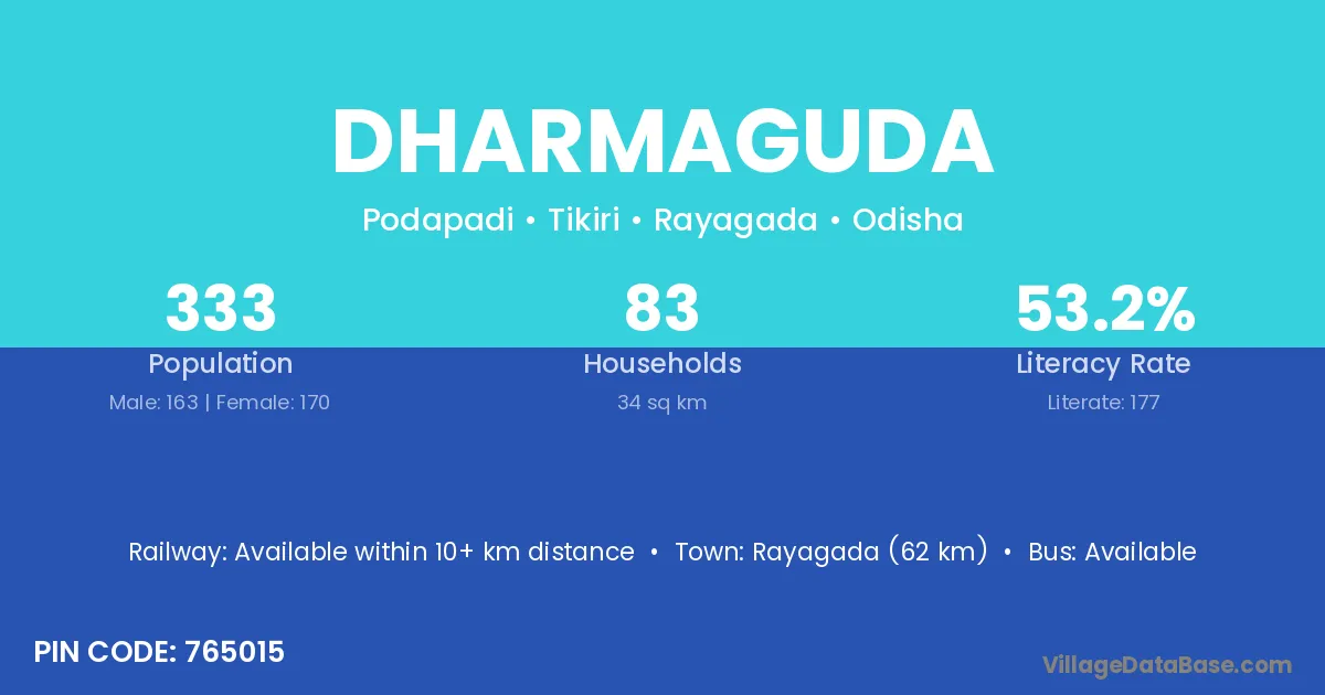 Rayagada (62 km) is the nearest town to Dharmaguda village for major economic activities and is located approximately 62 km away.