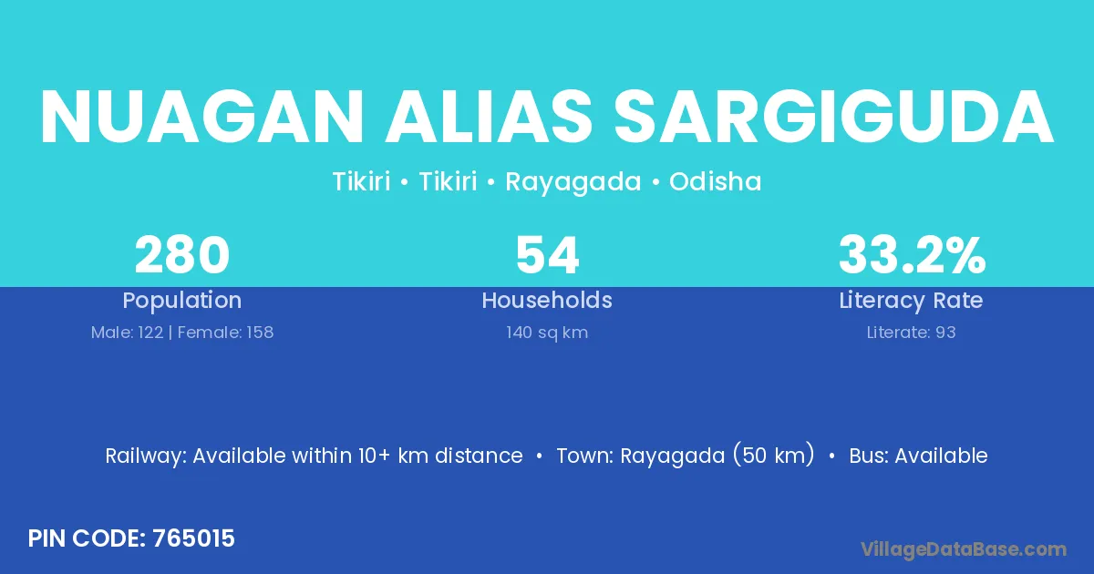 Rayagada (50 km) is the nearest town to Nuagan Alias Sargiguda village for major economic activities and is located approximately 50 km away.