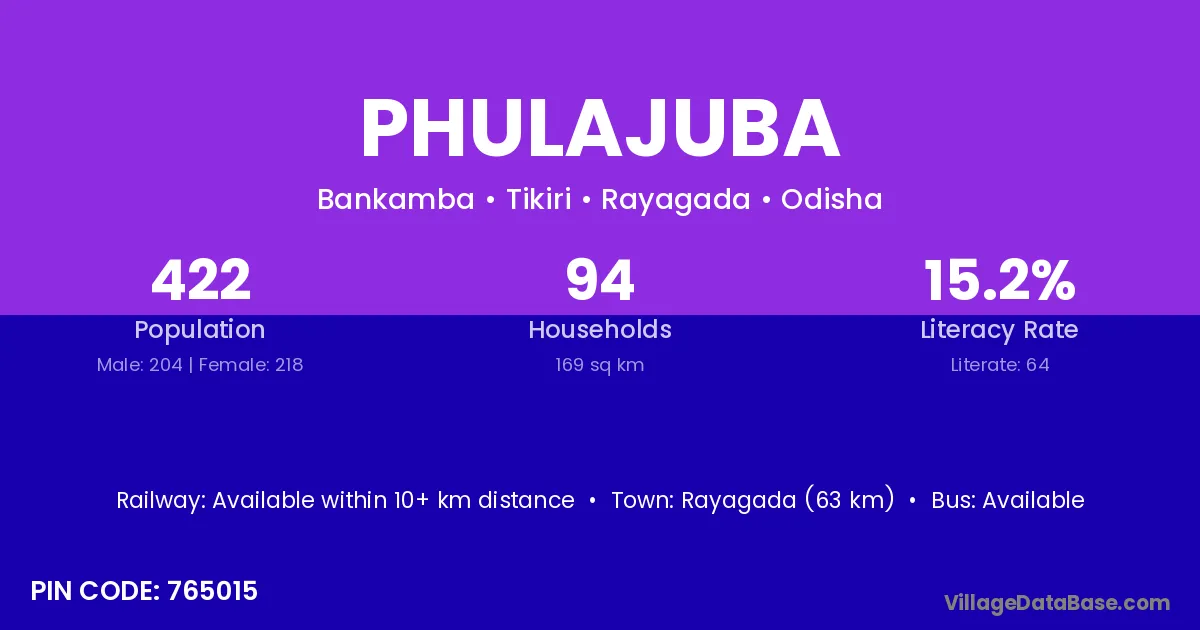 Rayagada (63 km) is the nearest town to Phulajuba village for major economic activities and is located approximately 63 km away.