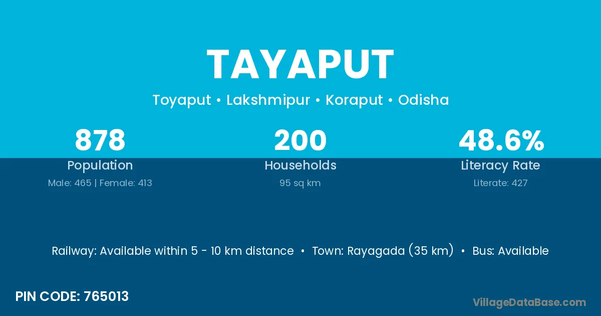 Rayagada (41 km) is the nearest town to Tayaput village for major economic activities and is located approximately 41 km away.