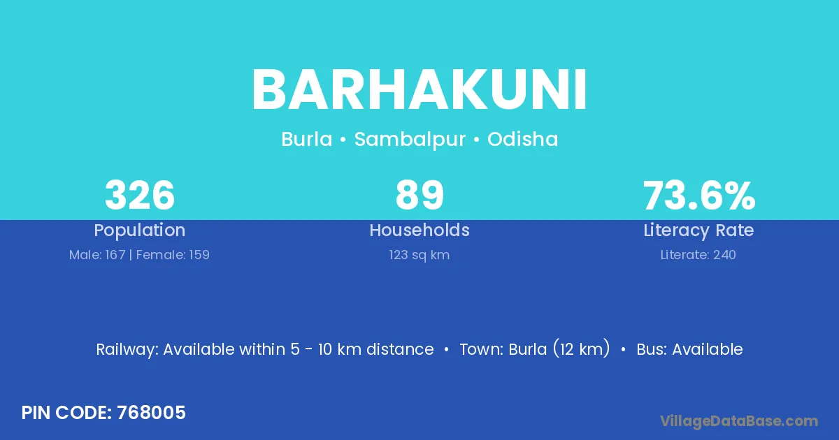 Burla (12 km) is the nearest town to Barhakuni village for major economic activities and is located approximately 12 km away.