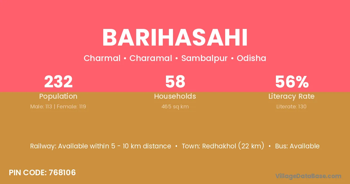 Redhakhol (22 km) is the nearest town to Barihasahi village for major economic activities and is located approximately 22 km away.