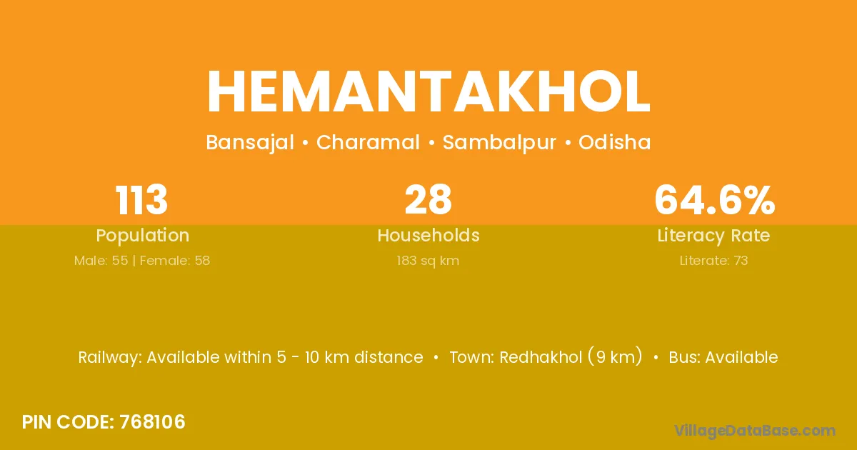 Hemantakhol village has a total population of 113 people, of which 55 are males and 58 are females.