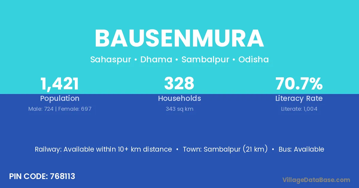 Sambalpur (21 km) is the nearest town to Bausenmura village for major economic activities and is located approximately 21 km away.