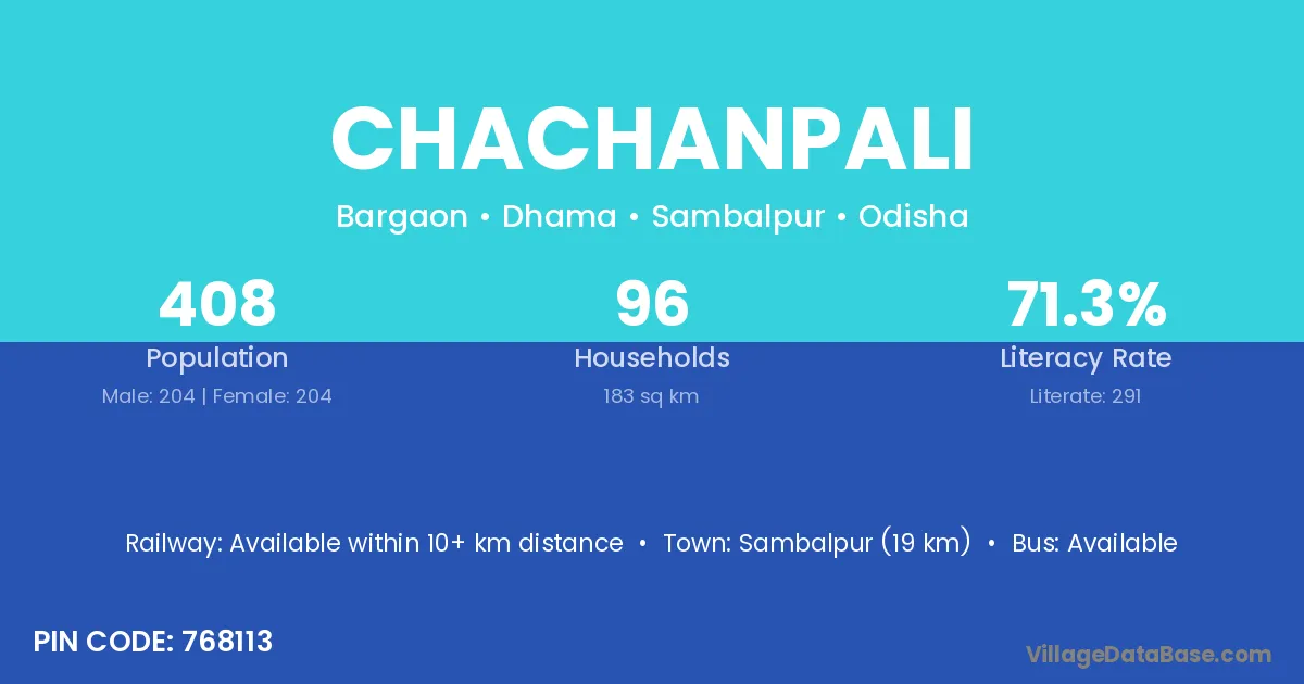 Chachanpali village has a total population of 408 people, of which 204 are males and 204 are females.