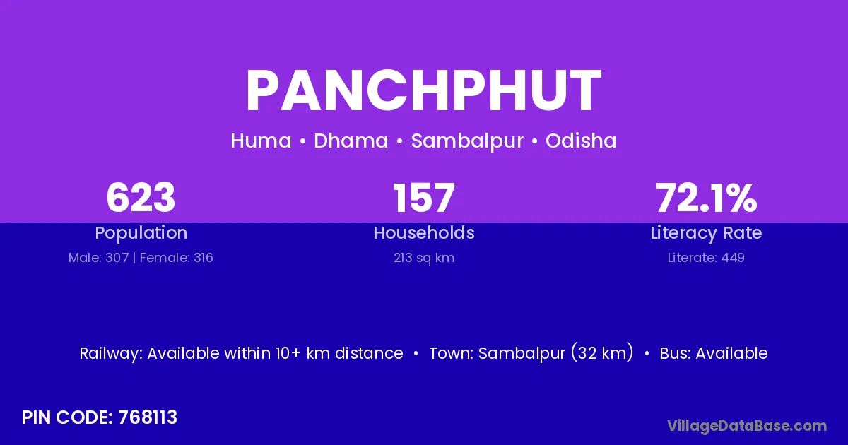 Sambalpur (32 km) is the nearest town to Panchphut village for major economic activities and is located approximately 32 km away.