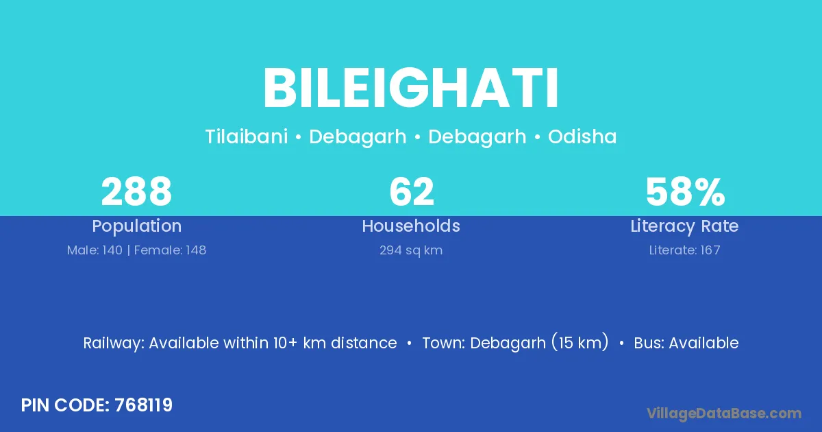 Rajagangapur (26 km) is the nearest town to Bileighati village for major economic activities and is located approximately 26 km away.