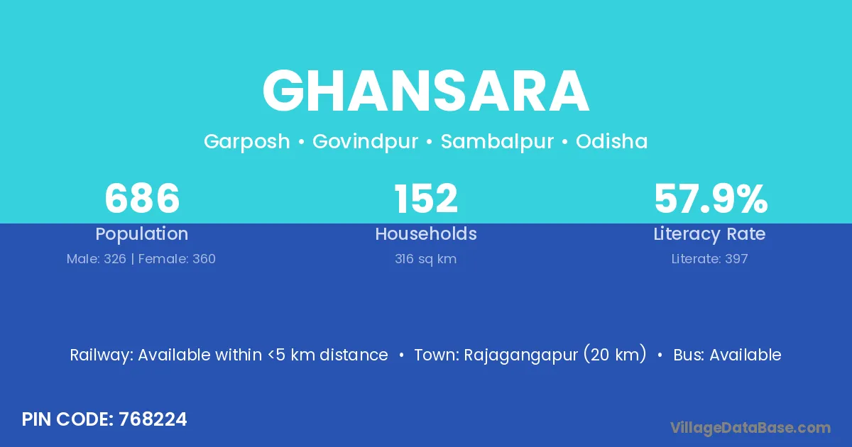 Rajagangapur (20 km) is the nearest town to Ghansara village for major economic activities and is located approximately 20 km away.