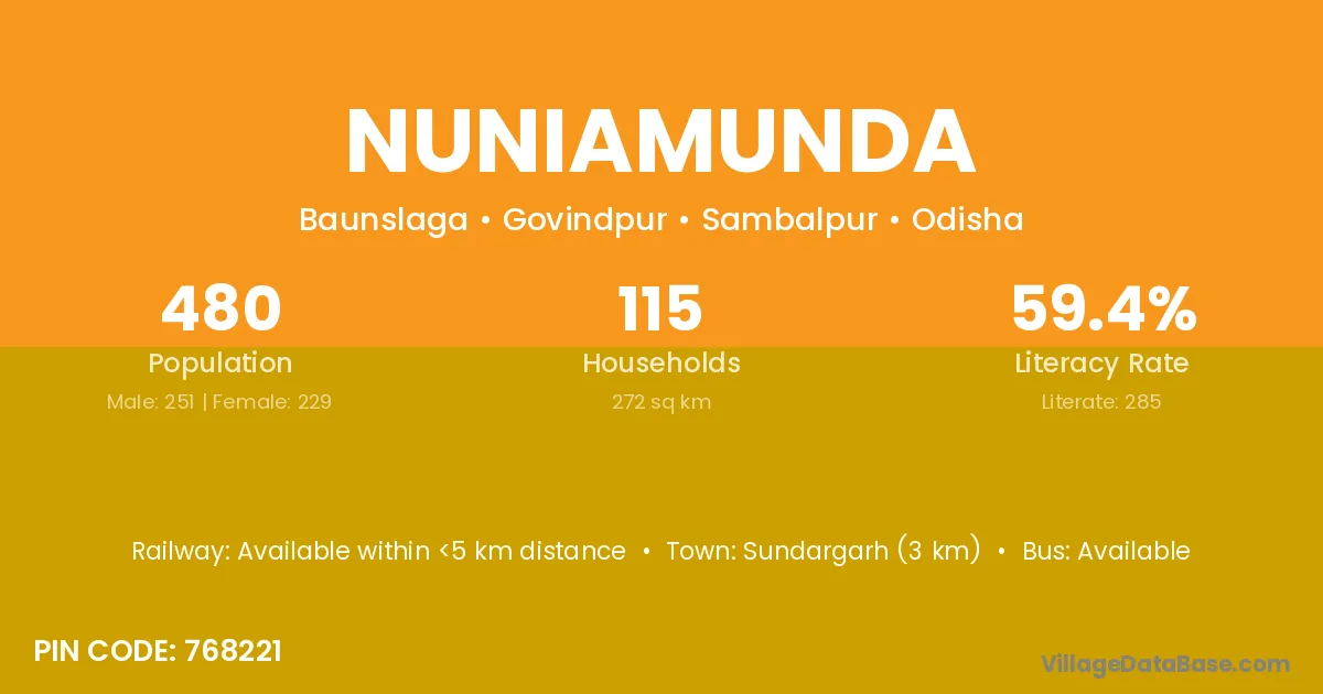 Sundargarh (3 km) is the nearest town to Nuniamunda village for major economic activities and is located approximately 3 km away.
