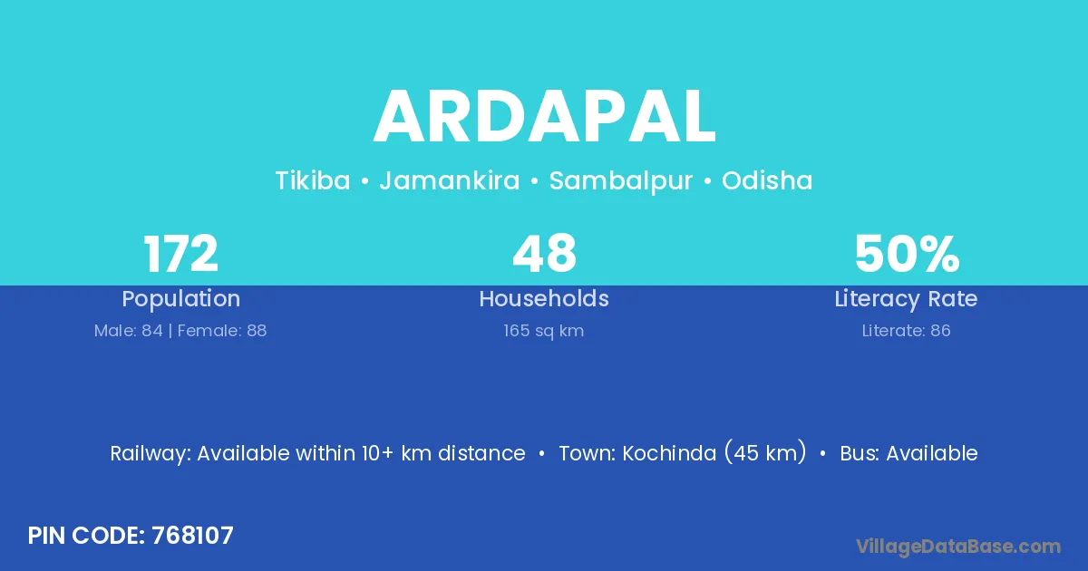 Kochinda (45 km) is the nearest town to Ardapal village for major economic activities and is located approximately 45 km away.