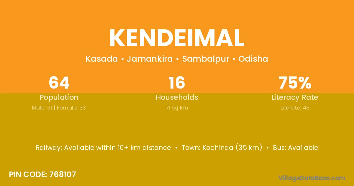 Kochinda (35 km) is the nearest town to Kendeimal village for major economic activities and is located approximately 35 km away.