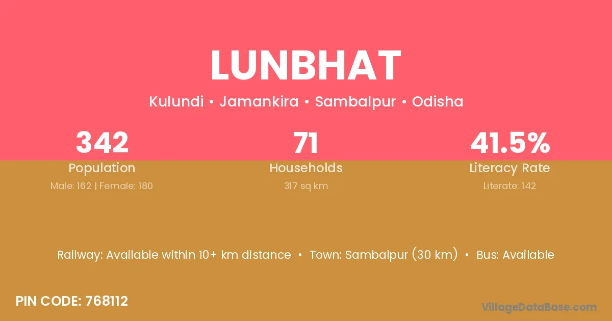 Sambalpur (30 km) is the nearest town to Lunbhat village for major economic activities and is located approximately 30 km away.