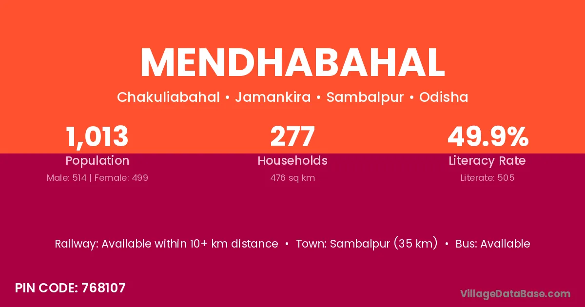 Sambalpur (35 km) is the nearest town to Mendhabahal village for major economic activities and is located approximately 35 km away.